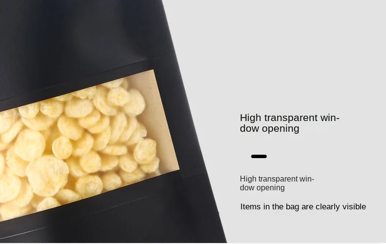 Product Introduction: Standing black kraft paper bag Product size: 8 sizes, size error of 2-3 mm. Packaging applications: food, 3c products, daily necessities. Product function: zipper seal can be reused.