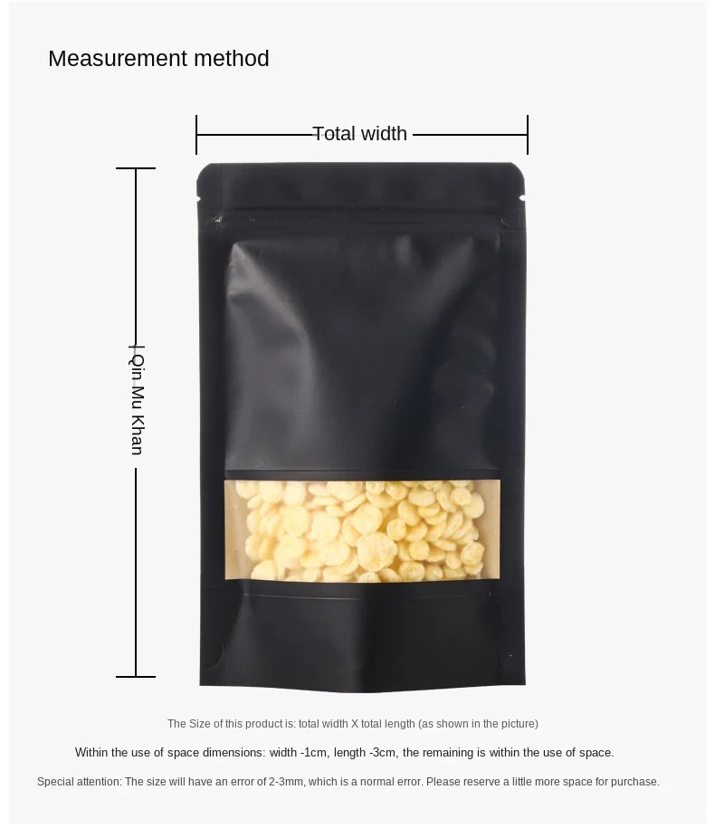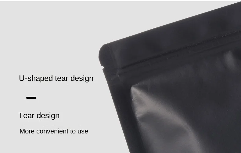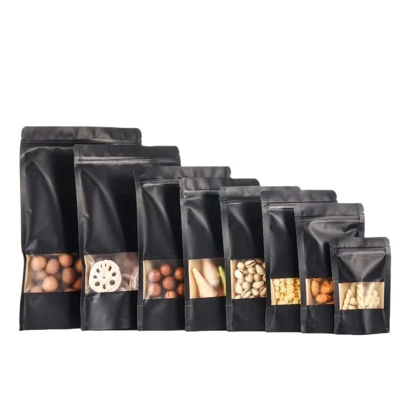 Product Introduction: Standing black kraft paper bag Product size: 8 sizes, size error of 2-3 mm. Packaging applications: food, 3c products, daily necessities. Product function: zipper seal can be reused.
