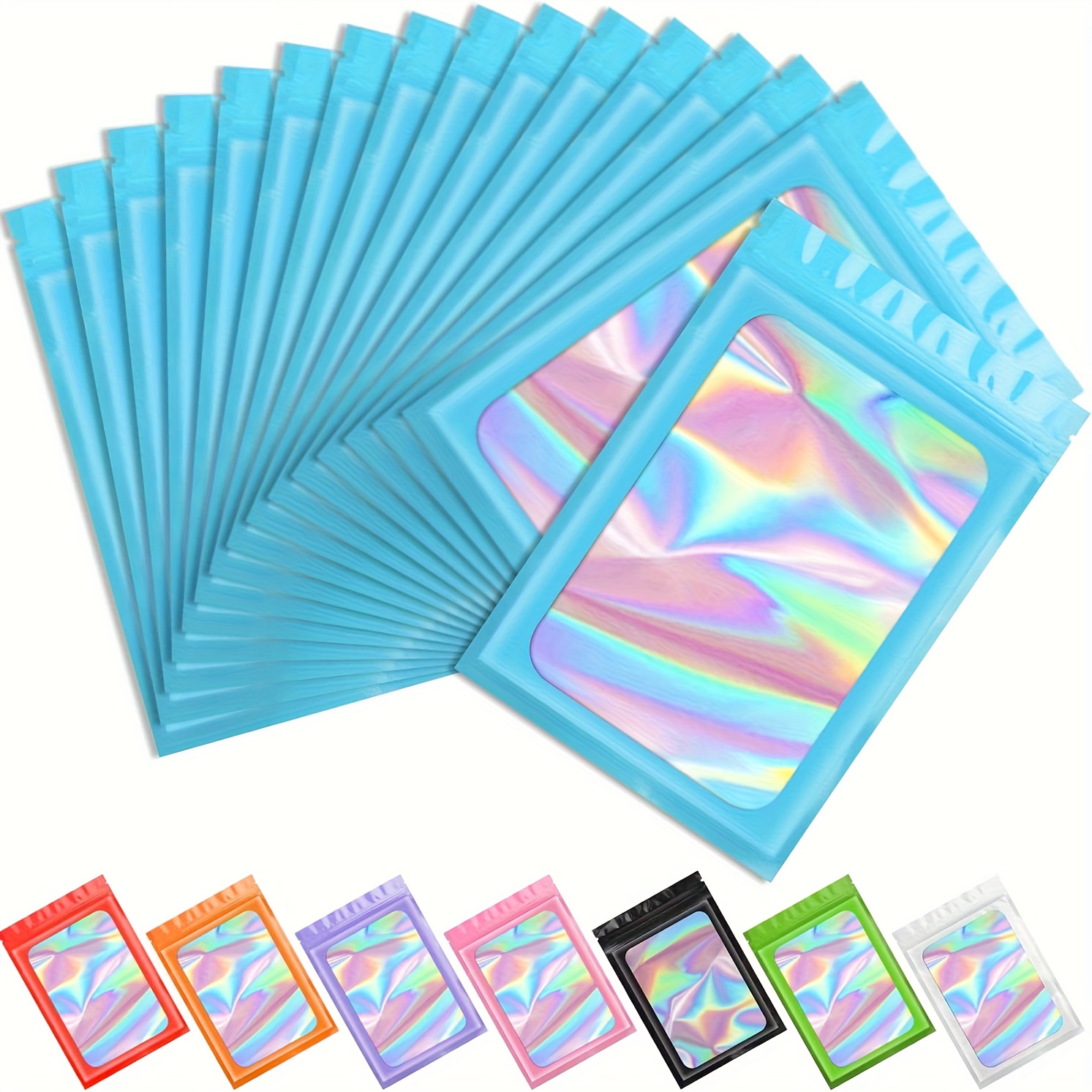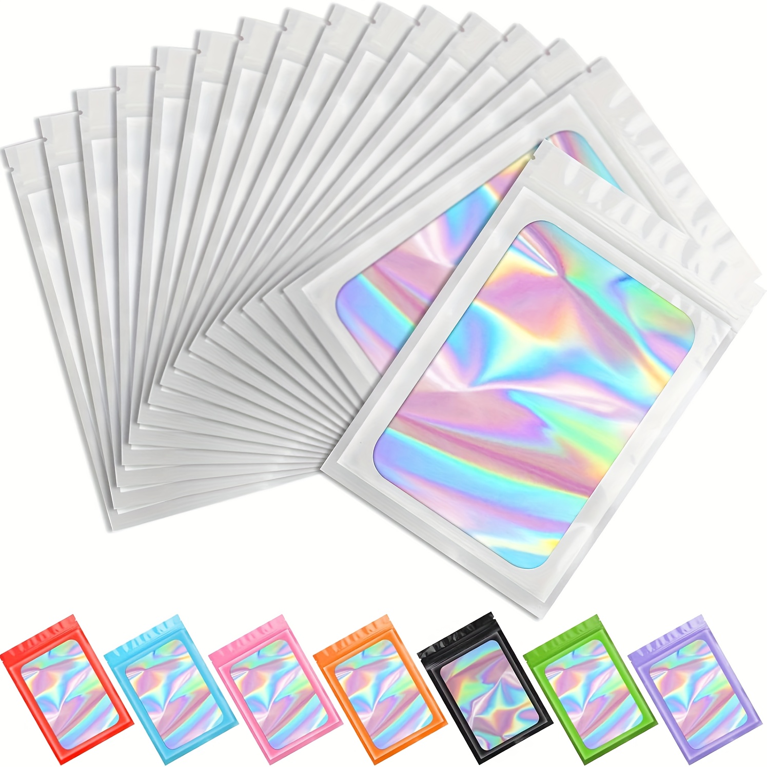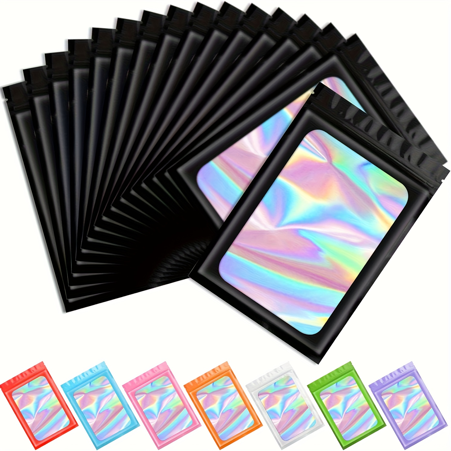 100 Pack Holographic Mylar Bags with Clear Window – 6.3×9.4 Inch Smell-Proof & High Quality Resealable Snap-Fit Foil Pouches, Iridescent Multicolor Pink, Blue, Green, Purple, Orange, Yellow, Red, Brown, Black, White for Food, Candy, Snacks, Retail Packa
