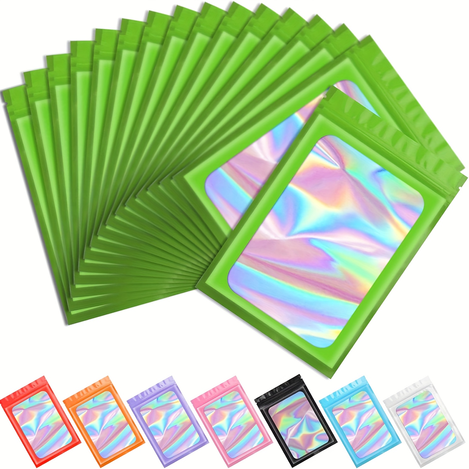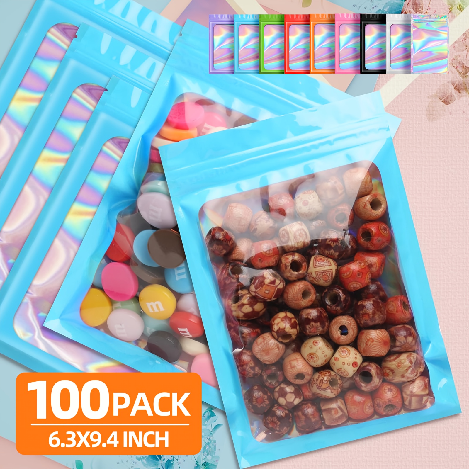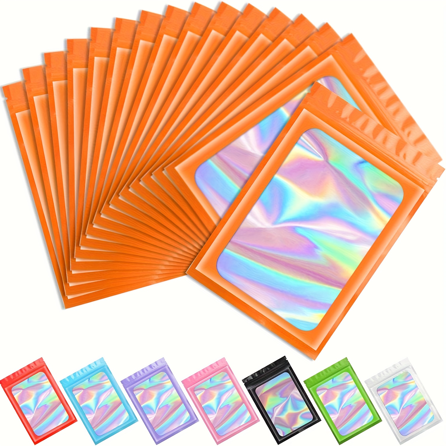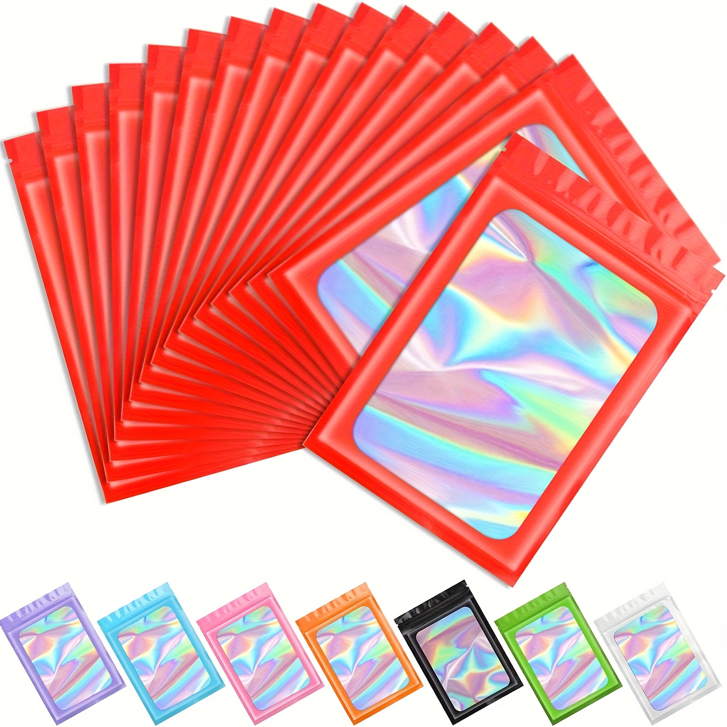 100 Pack Holographic Mylar Bags with Clear Window – 6.3×9.4 Inch Smell-Proof & High Quality Resealable Snap-Fit Foil Pouches, Iridescent Multicolor Pink, Blue, Green, Purple, Orange, Yellow, Red, Brown, Black, White for Food, Candy, Snacks, Retail Packa
