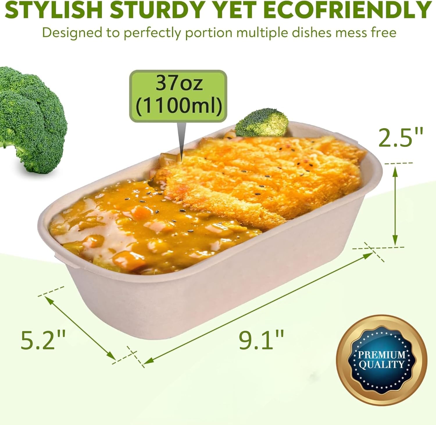 Single Compartment Design with Secure Lids: These are perfect for various meal types, featuring improved lids with dual tabs for a secure closure. While not airtight, the lids securely fits on the bowl, making them ideal for meal prep, parties, or events. Resistant to oil, liquids, and cuts, they ensure mess-free meals. These heavy-duty bamboo food containers can withstand hot and gravy dishes without leaking from the bottom. Each pack includes 50 containers for versatile use.