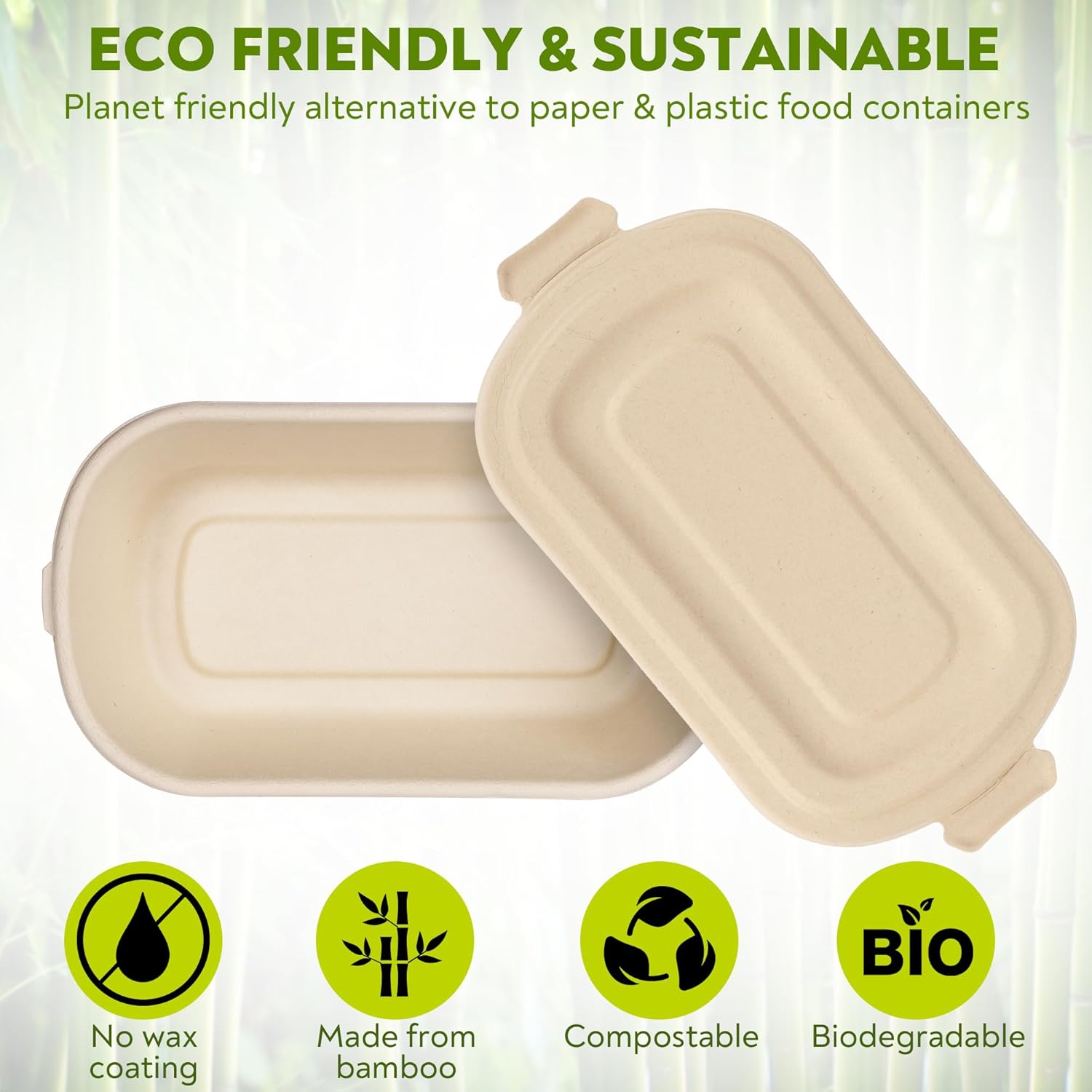 Sustainable Plant-Based Containers: Crafted from bamboo fiber, our disposable meal prep containers offer an eco-friendly alternative to traditional styrofoam and plastic options. Designed with sustainability in mind, these containers help reduce plastic waste and support tree conservation while naturally breaking down over time, aligning with eco-conscious values and minimizing environmental impact.