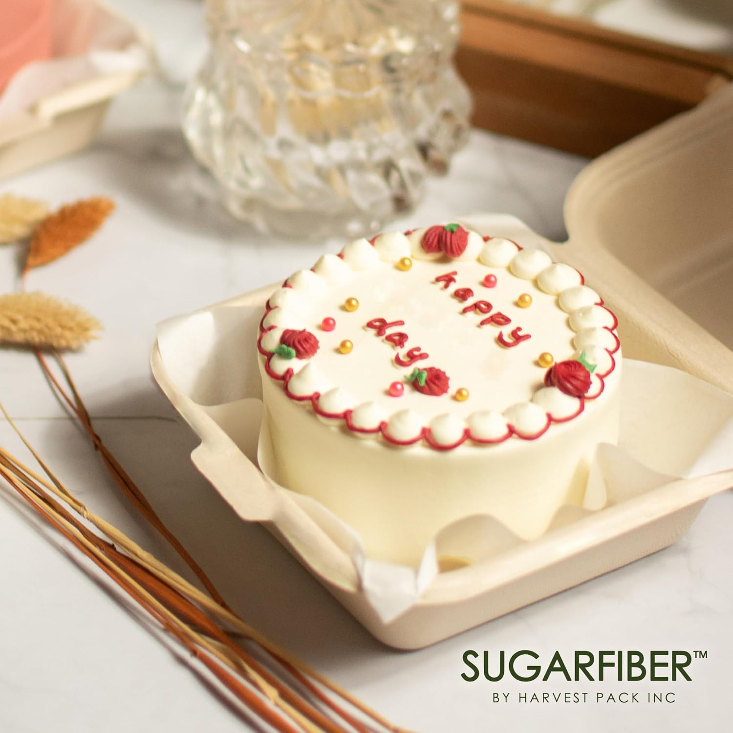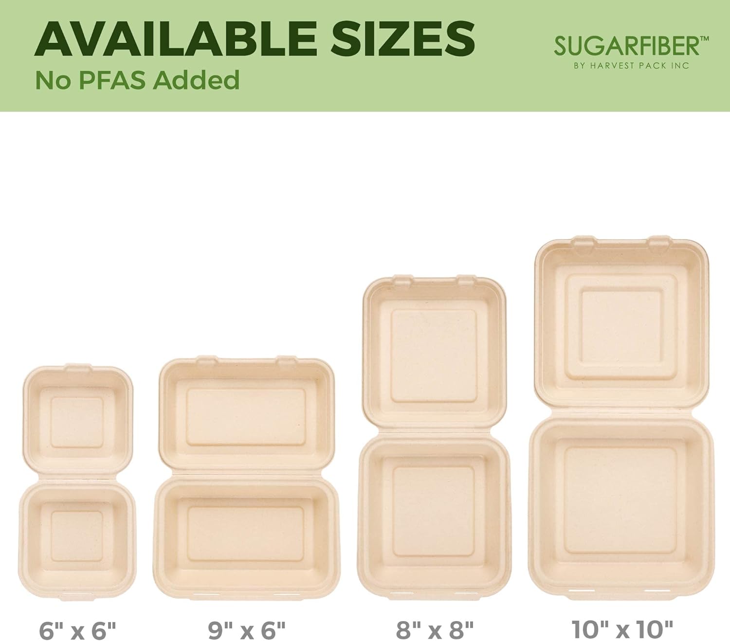 [50 COUNT]Harvest Pack PFAS FREE 6 X 6&quote; Compostable Square Hinged, Single Compartment Clamshell Takeout Food Containers, Heavy-Duty Bagasse To go Container, Made from Eco-Friendly Sugarcane Fibers