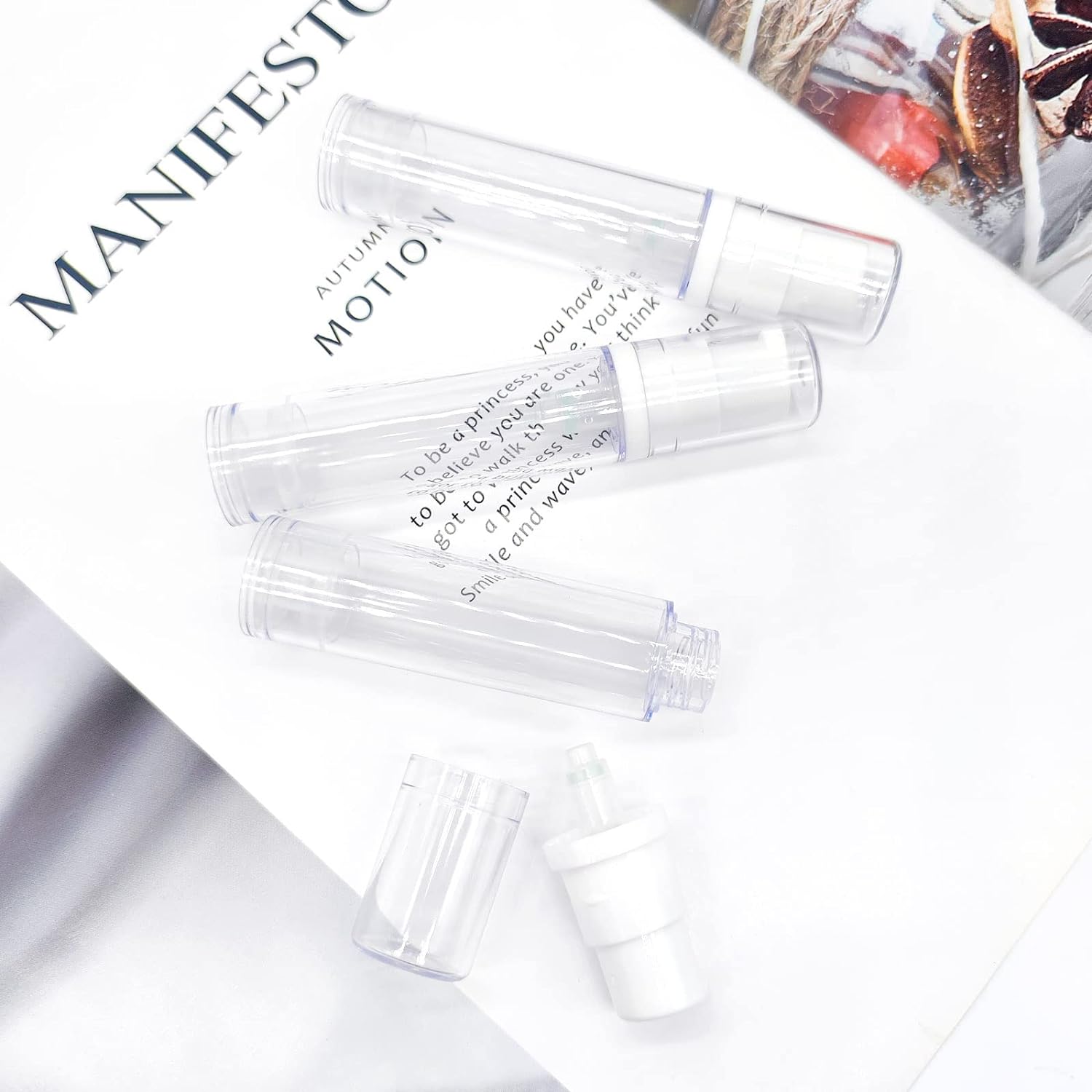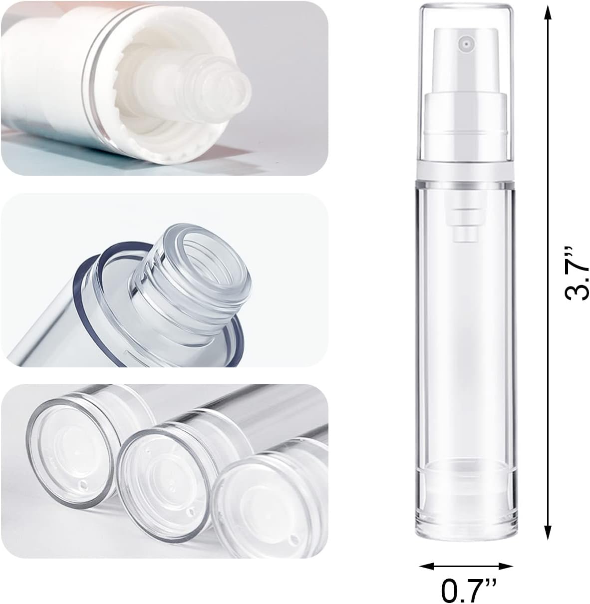 - The height of the airless pump container: 9.4cm / 3.7inch, diameter: 1.9cm / 0.7inch. Capacity: 10ml. Color: Transparent.