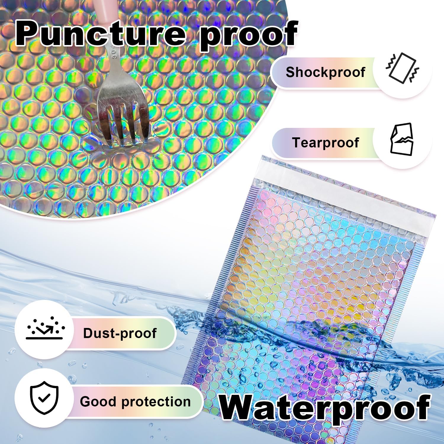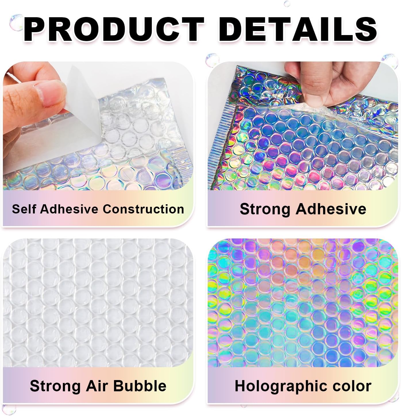 𝐇𝐨𝐥𝐨𝐠𝐫𝐚𝐩𝐡𝐢𝐜 𝐃𝐞𝐬𝐢𝐠𝐧: Our holographic bubble mailers feature a beautiful holographic design, adding a touch of eye catching appeal to your packaging. Stylish colors make your package impressive and stand out.