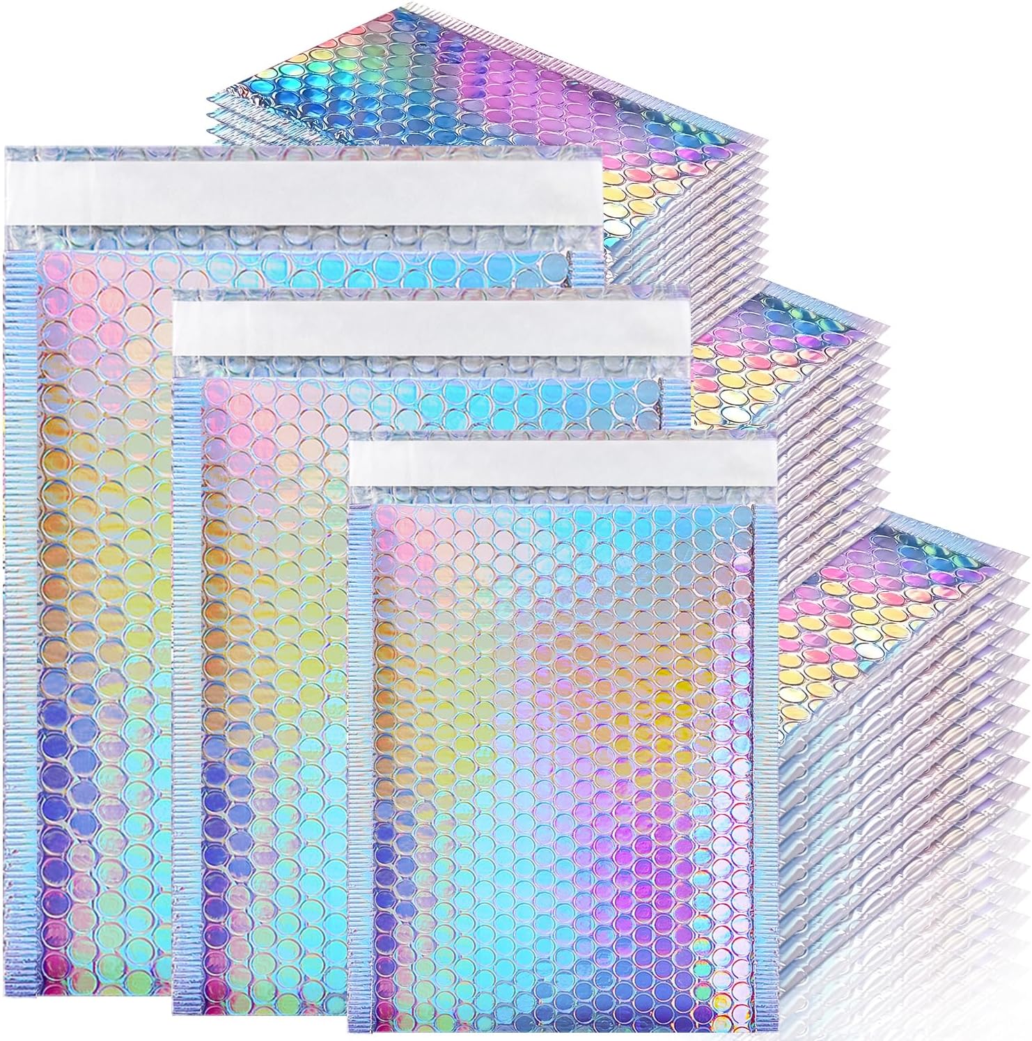 Our 50pcs holographic bubble mailers in 3 different sizes, 30pcs of 7.6*5.0in external size, 12pcs of 9.5*5.8in external size and 8pcs of 11.5*7.8in external size.