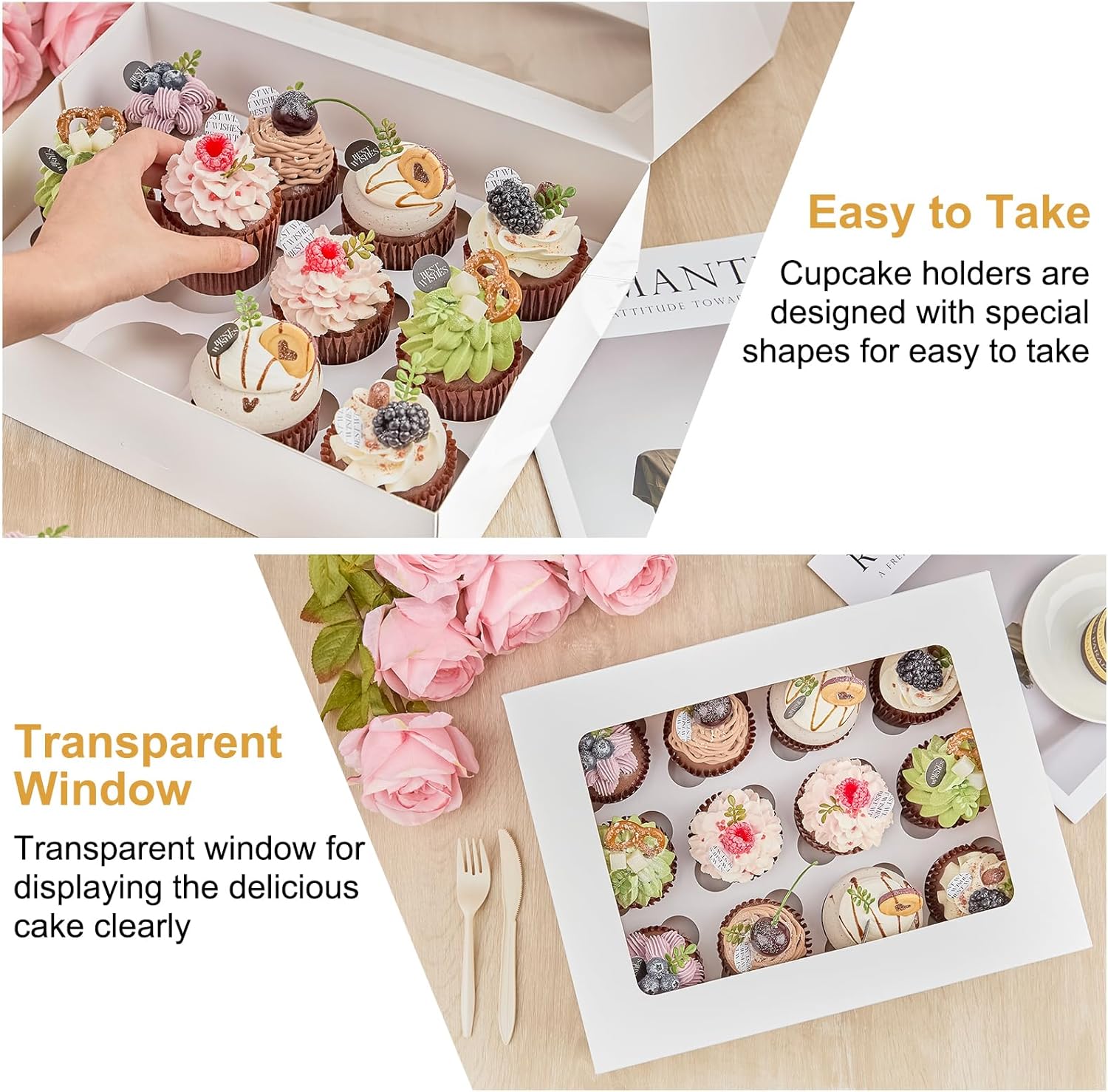 Premium Material: Made of food grade cardboard, the white cupcake boxes are odorless, sturdy and stable. Large clear PET window allows for a clear view of the desserts inside