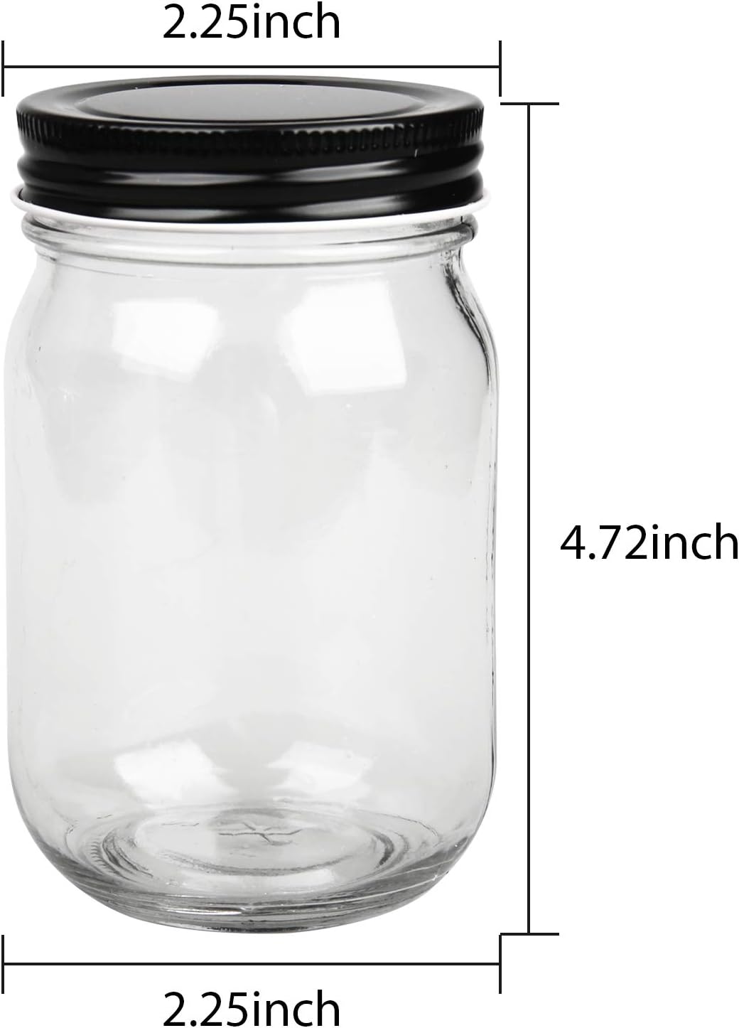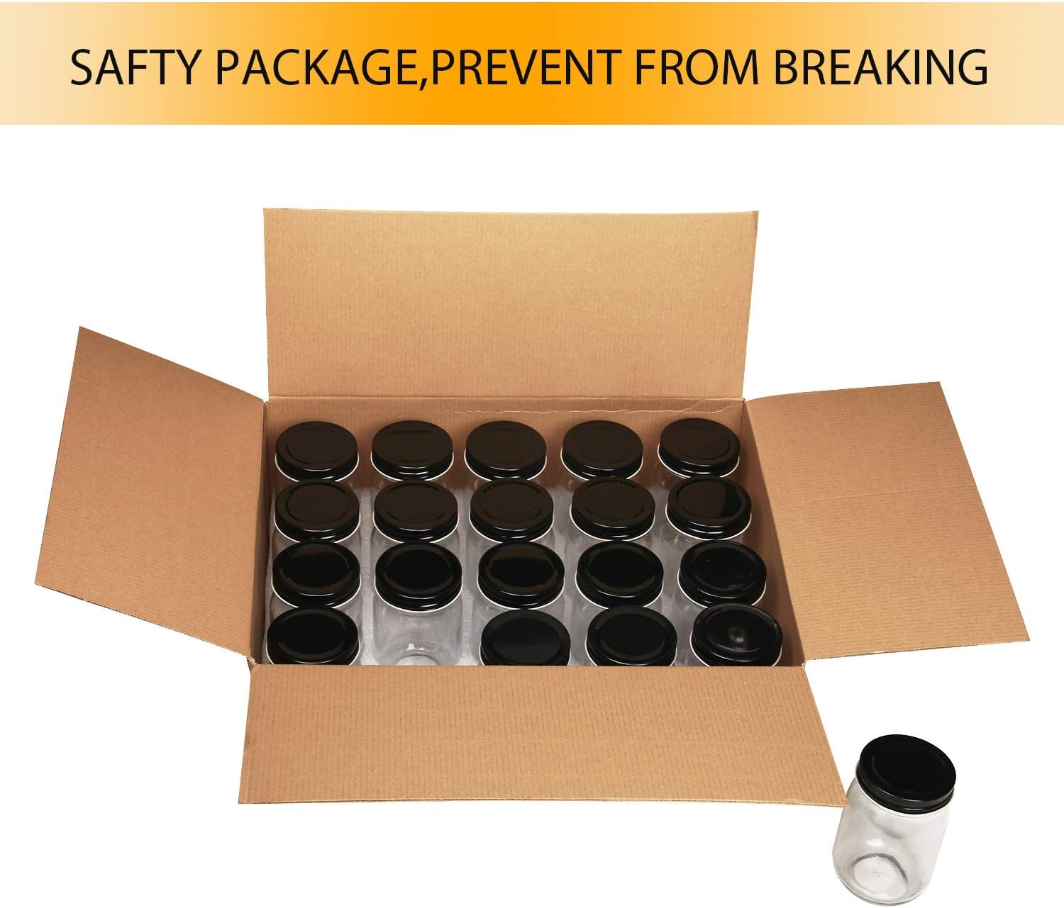 High Quality Jars: 20 pack 12 oz mason glass jar set with black lids,which is made of the highest quality materials for maximum durability and convenience.Large volume,hold 12oz,thick glass,lead free food safe glass jars ,size:2.55″ bottom*4.82″ height*2.55 mouth.The jars are safe for dishwasher and microwave but without the lid.
