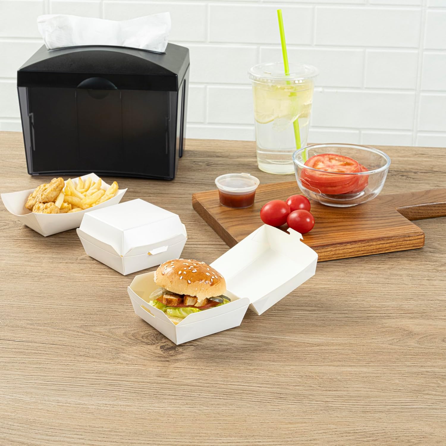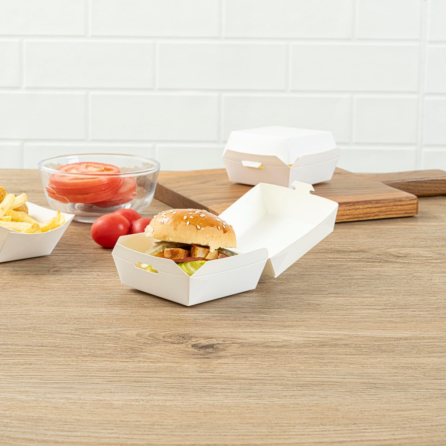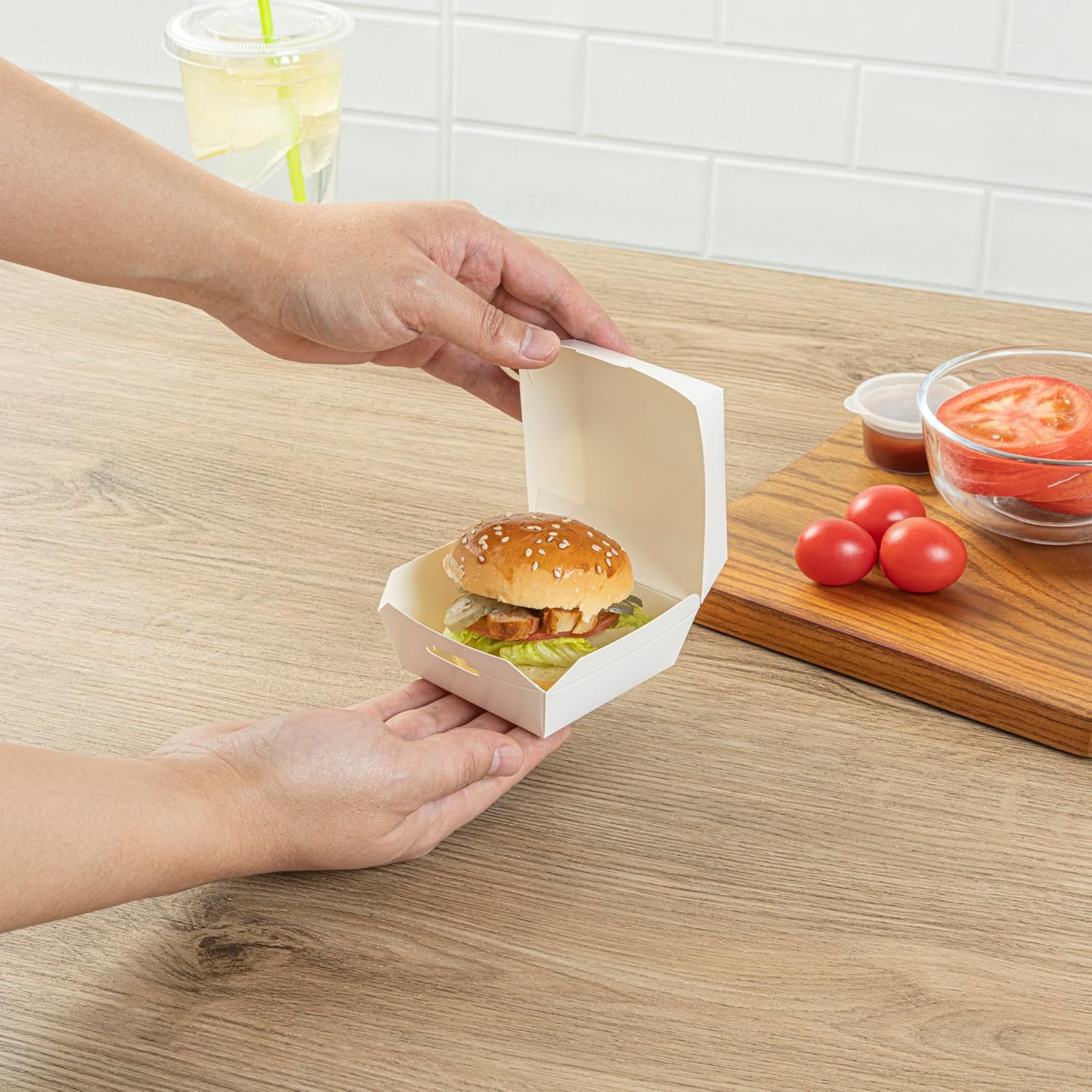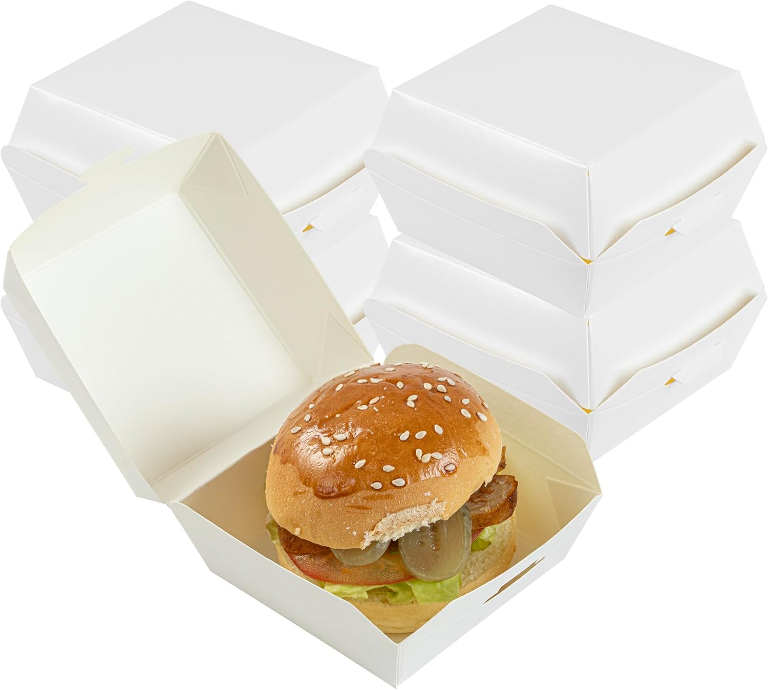 VERSATILE DESIGN: The elegant white finish of these take out boxes complements the theme and decor of cafes and restaurants. Serve your burgers in these stylish boxes!